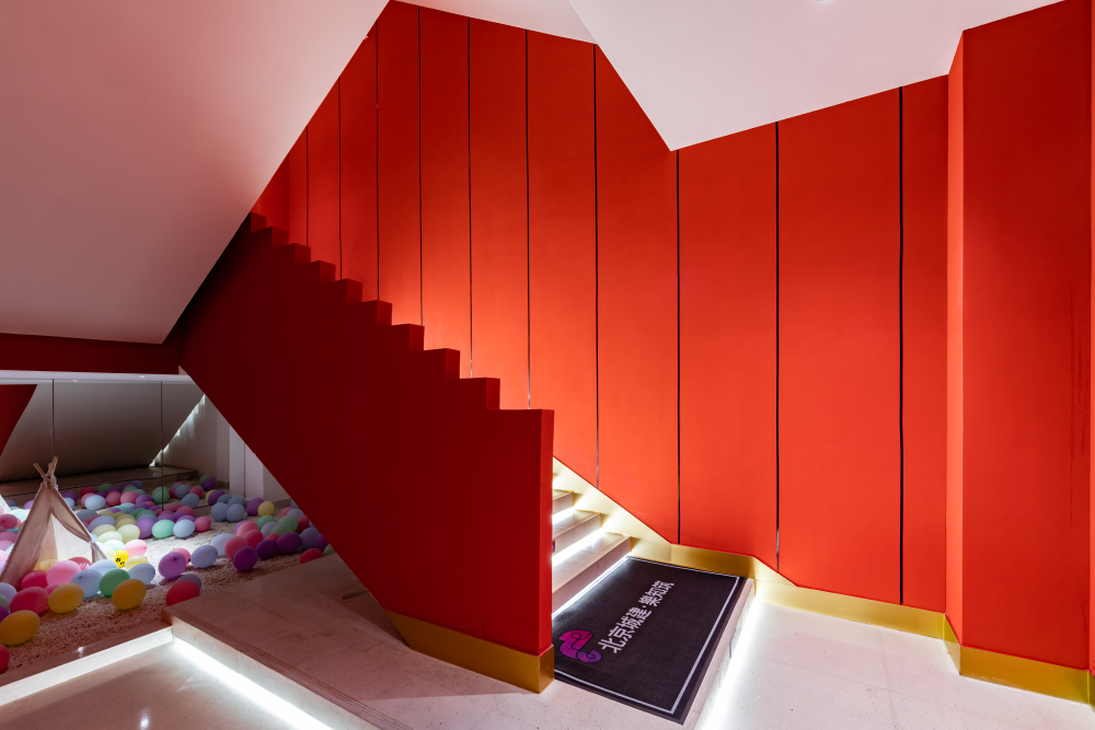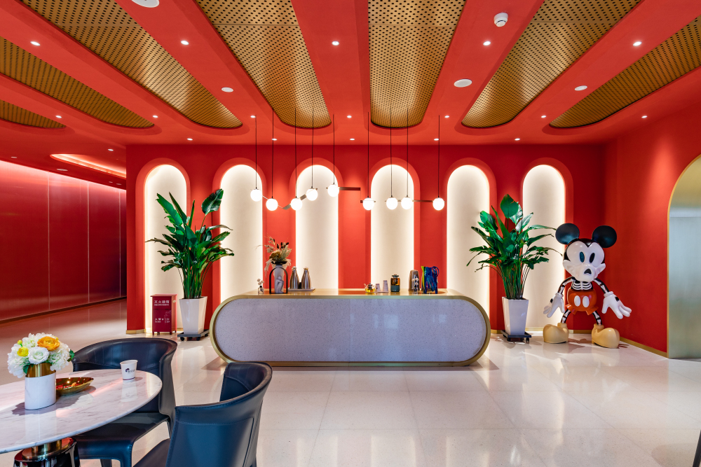 大膽的紅白金配色,呈現(xiàn)出更精致的撞色感,明亮的燈光下,墻壁線條感流暢,光影明媚,整個大廳在一派大方中盡顯富麗堂皇。